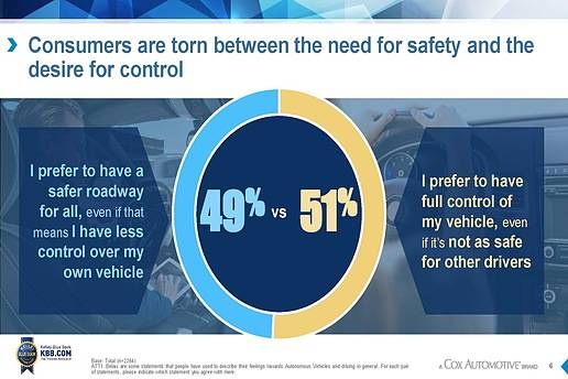 Kelley Blue Book said it commissioned the national study “to understand current consumer perceptions and misconceptions of autonomous vehicles overall—and by each level of autonomy.” One of the survey’s most comprehensive conclusions found that consumers “are torn between the need for safety and the desire for control, with 51% of respondents replying that they prefer to have full control of their vehicle, even if it’s not as safe for other drivers, while 49% prefer to have a safer roadway for all, even if that means they have less control over their own vehicle.”